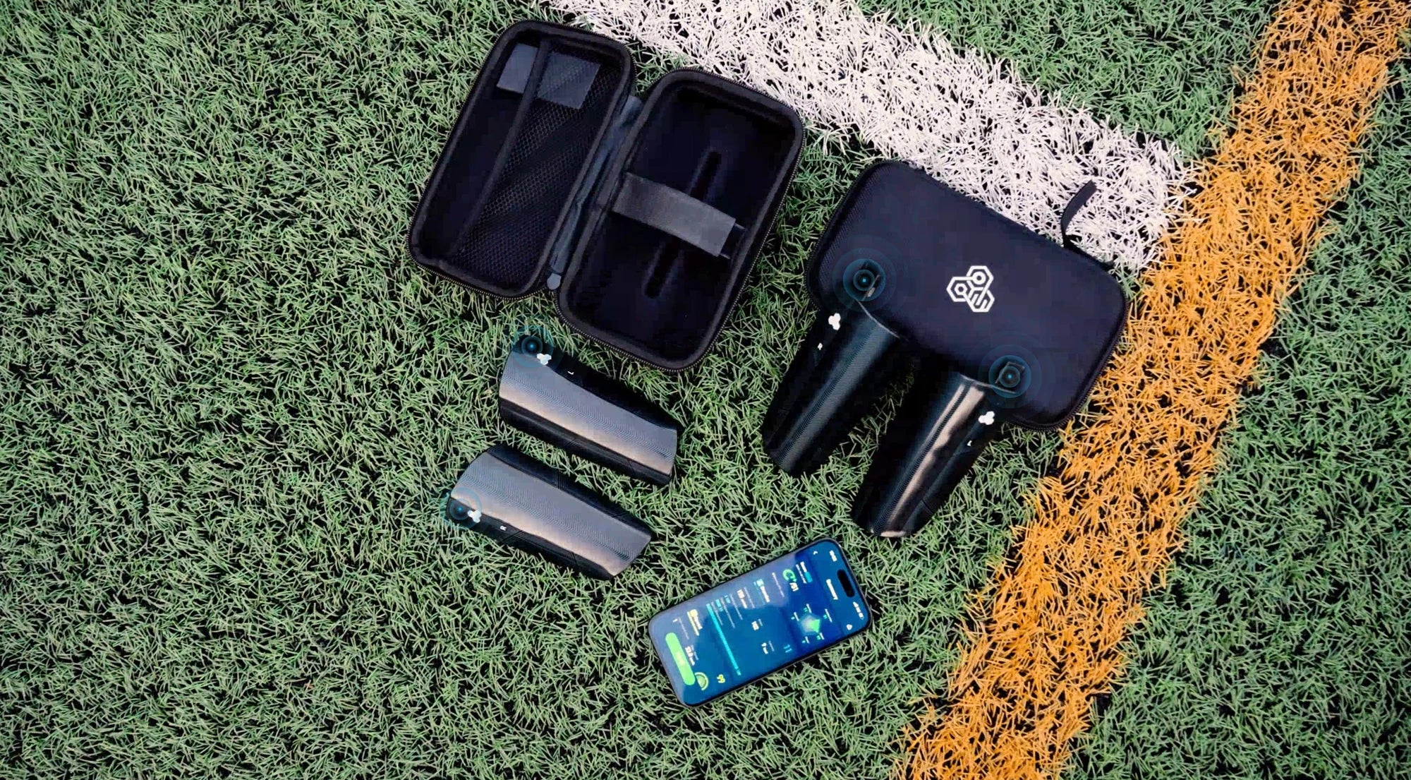 - Turn on the soccer player trackers and insert them into the corresponding smart shin guards.